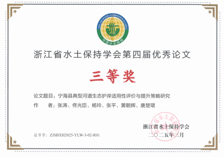 會(huì)議現(xiàn)場(chǎng)通報(bào)了2024年度生產(chǎn)建設(shè)項(xiàng)目水土保持方案優(yōu)秀單位、2024年度生產(chǎn)建設(shè)項(xiàng)目水土保持監(jiān)測(cè)優(yōu)秀單位,并為獲獎(jiǎng)集體進(jìn)行表彰。隨后,又現(xiàn)場(chǎng)表彰了浙江省水土保持學(xué)會(huì)第四屆優(yōu)秀論文評(píng)選結(jié)果。我院榮獲2024年度生產(chǎn)建設(shè)項(xiàng)目水土保持方案優(yōu)秀單位、2024年度生產(chǎn)建設(shè)項(xiàng)目水土保持監(jiān)測(cè)優(yōu)秀單位兩項(xiàng)集體榮譽(yù),并且以論文《寧海縣典型河道生態(tài)護(hù)岸適用性評(píng)價(jià)與提升策略研究》獲得浙江省水土保持學(xué)會(huì)第四屆優(yōu)秀論文三等獎(jiǎng)。
