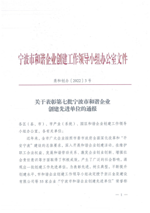 近日,為樹立典型示范,促進我市廣大企業(yè)發(fā)展和諧勞動關(guān)系,增強社會責(zé)任意識,提升創(chuàng)建水平,寧波市和諧企業(yè)創(chuàng)建工作領(lǐng)導(dǎo)小組公布“寧波市和諧企業(yè)創(chuàng)建先進單位”評選結(jié)果,表彰在創(chuàng)建工作中表現(xiàn)卓越的先進單位。經(jīng)評定,共授予55家企業(yè)“寧波市和諧企業(yè)創(chuàng)建先進單位”榮譽稱號,我院光榮在列!