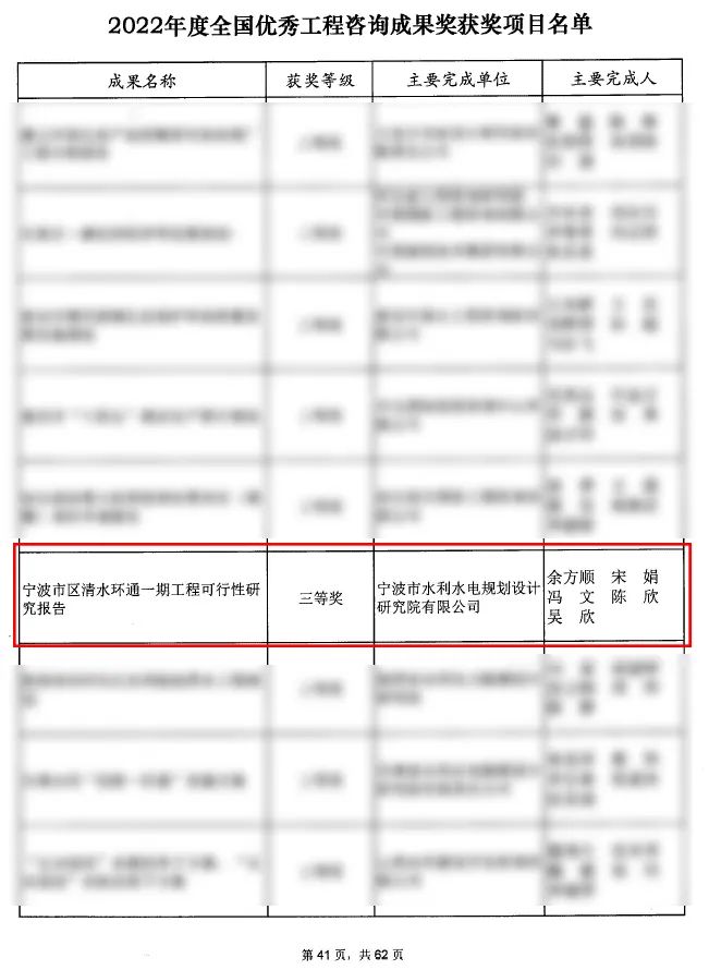 近日,中國工程咨詢協(xié)會公布2022年度全國優(yōu)秀工程咨詢成果獎獲獎項目名單,寧波市水利院申報的《寧波市區(qū)清水環(huán)通一期工程可行性研究報告》咨詢成果順利通過公示,榮獲2022年度全國優(yōu)秀工程咨詢成果三等獎!該獎項由中國咨詢工程協(xié)會組織申報評審,每兩年評選一次,是中國工程咨詢行業(yè)含金量最高的獎項。