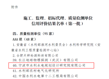 今年,寧波市水利院繼信息化業(yè)務(wù)企業(yè)信用獲評AAA最高等級后,再創(chuàng)佳績,勘察、設(shè)計、咨詢、質(zhì)量檢測4項業(yè)務(wù)獲評AAA級,水資源論證,水文、水資源調(diào)查評價,水土保持方案編制3項獲評AAA+級,均為最高等級。其中,水文、水資源調(diào)查評價,質(zhì)量檢測兩項為首次參評。